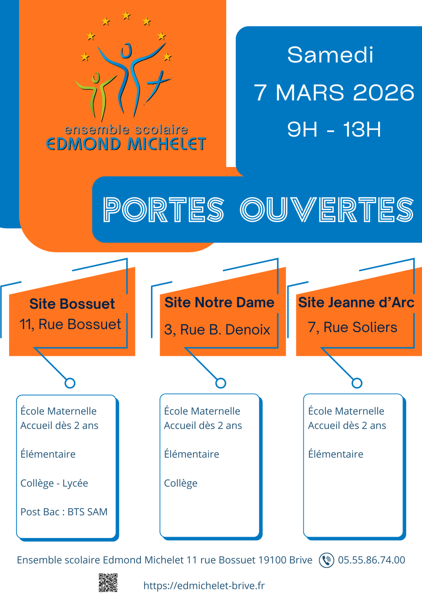 Samedi 07 mars 2026 l'ensemble scolaire Edmond Michelet vous ouvre ses portes sur les 3 sites.